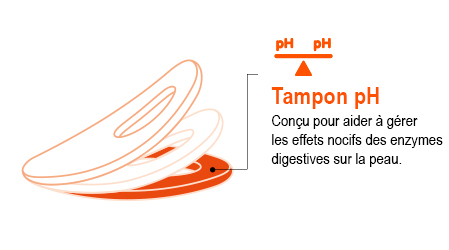 Les effluents contiennent des enzymes digestives qui décomposent les protéines et les lipides. Ces enzymes digestives sont actives à pH proche du neutre. Tout contact des effluents avec la peau saine, qui est légèrement acide (pH 4-6), peut altérer le pH de la peau et décomposer les cellules cutanées, ce qui entraine une irritation péristomiale.La formule tampon pH de l’anneau Dansac TRE a été conçu pour aider à maintenir le pH naturel de la peau saine, afin de réduire ainsi l'activité des enzymes digestives.